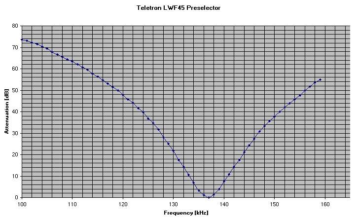 The receiver has four different bandwidths of +/-200 Hz, +/-425 Hz, +/-750 Hz, +/-1250 Hz, which is a little bid wide for most of our purposes. Therefore I make use only of the pre-selector section of this unit, which is equipped with two tubes EF93 and has four tunable circuits. For details on the curve see the graph below.
